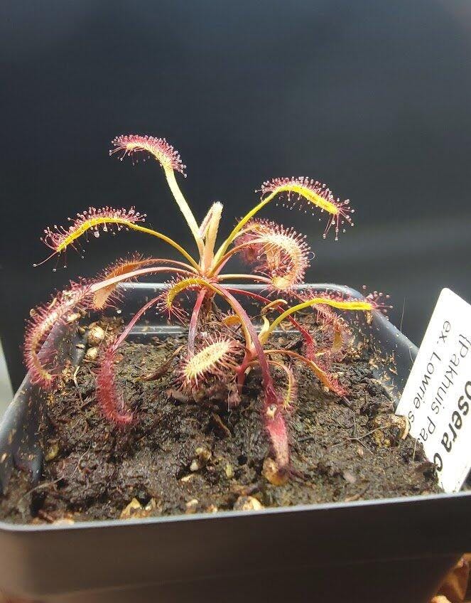 Native to the Cape region of South Africa (hence, the name), this hardy and highly adaptable sundew is a terrestrial species often grows in seepages or sandy, nutrient-poor soils kept consistently moist. It forms elegant rosettes of long, dew-covered leaves and bears tall stalks of numerous pink flowers. It's truly one of the easiest and most rewarding carnivorous plants to grow. This form is one of my favorites, growing incredibly upright compared to the standard D. capensis, with leaves only starting to reflex as they start to die back. Originally introduced into cultivation from seeds from Allen Lowrie, this form is a must have for D. capensis collectors.